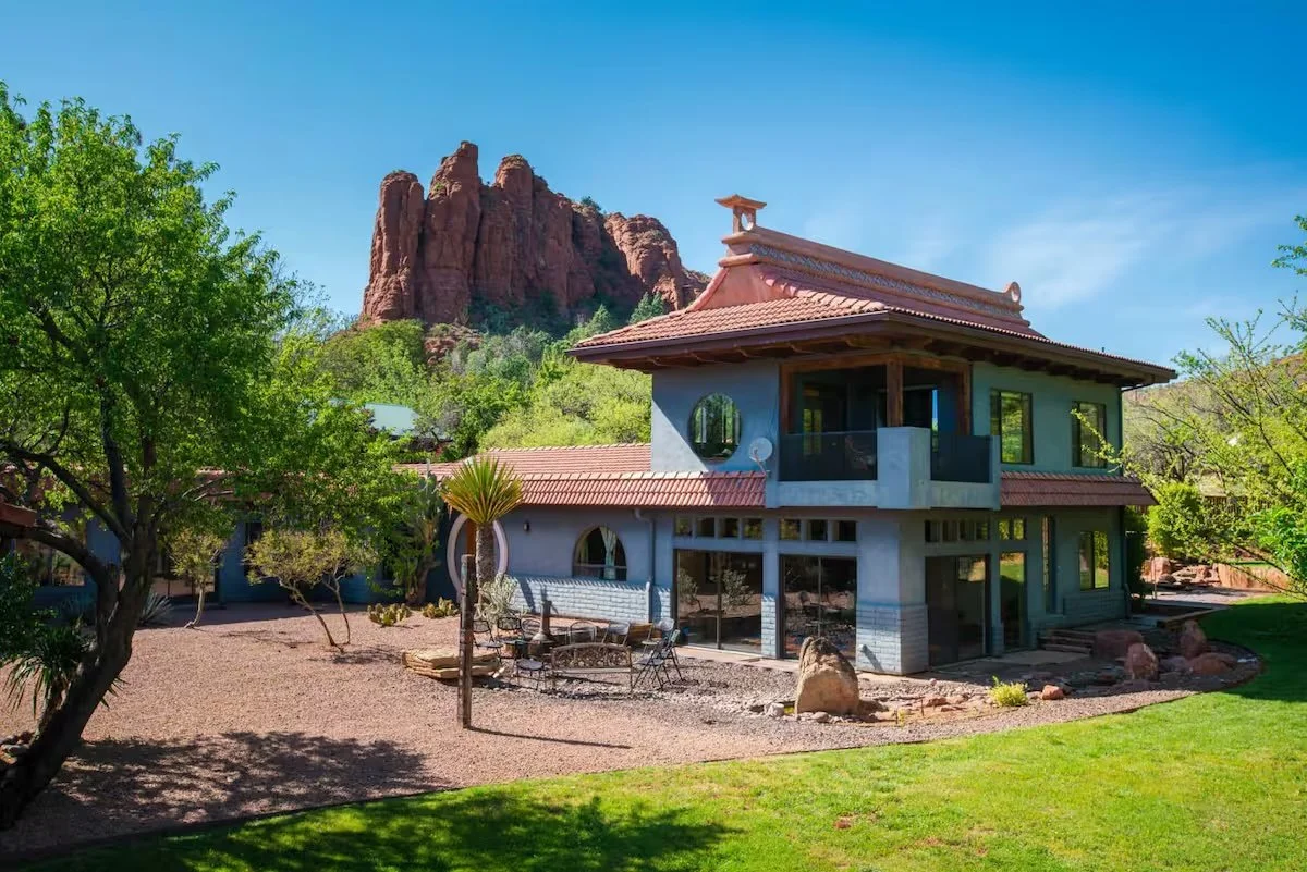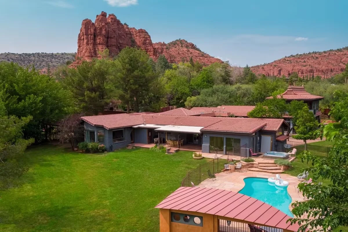 Nestled in the heart of Sedona, this stunning 6,700-square-foot sanctuary is surrounded by red rock views and lush greenery. The gourmet kitchen features a commercial range and dual refrigerators, perfect for entertaining up to 20 guests. Enjoy the heated pool, jacuzzi, and dedicated meditation and yoga spaces. The 1.7-acre fenced property showcases multiple patios and a fire pit - creating an unforgettable retreat.