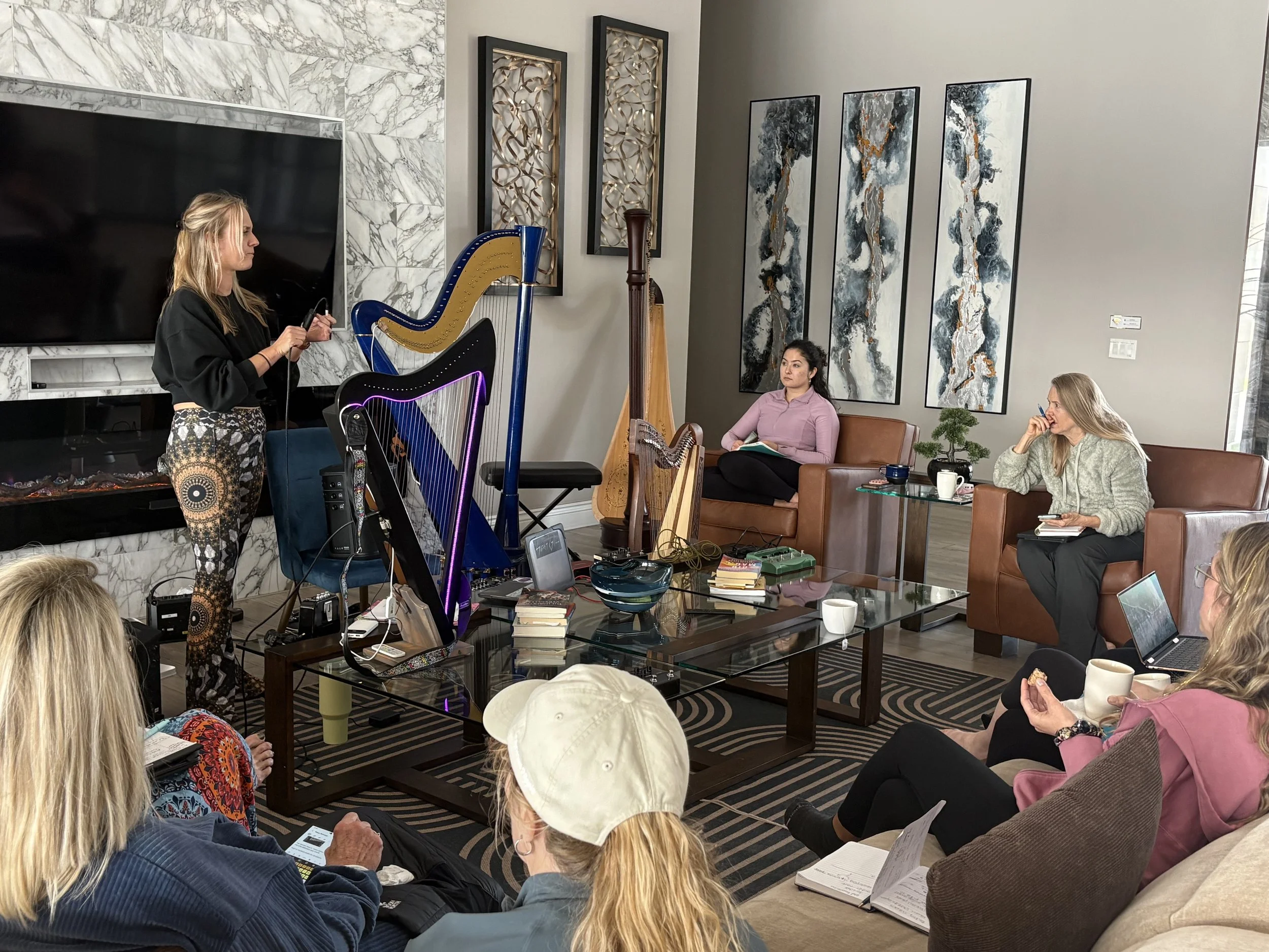 Since then, I’ve hosted two incredible harp retreats (May 2025 and January 2026), each with its own unique energy and dynamic. When we gather and share our stories, a common thread often emerges. Many of us were classically trained — I hold both a BA in Music and a MM in Harp Performance — and were guided toward orchestral paths. Somewhere along the way, some of us experienced burnout, stepped away, or explored entirely different careers. And yet, we found our way back to the harp — whether as a creative outlet, a personal refuge, or a full-time calling.